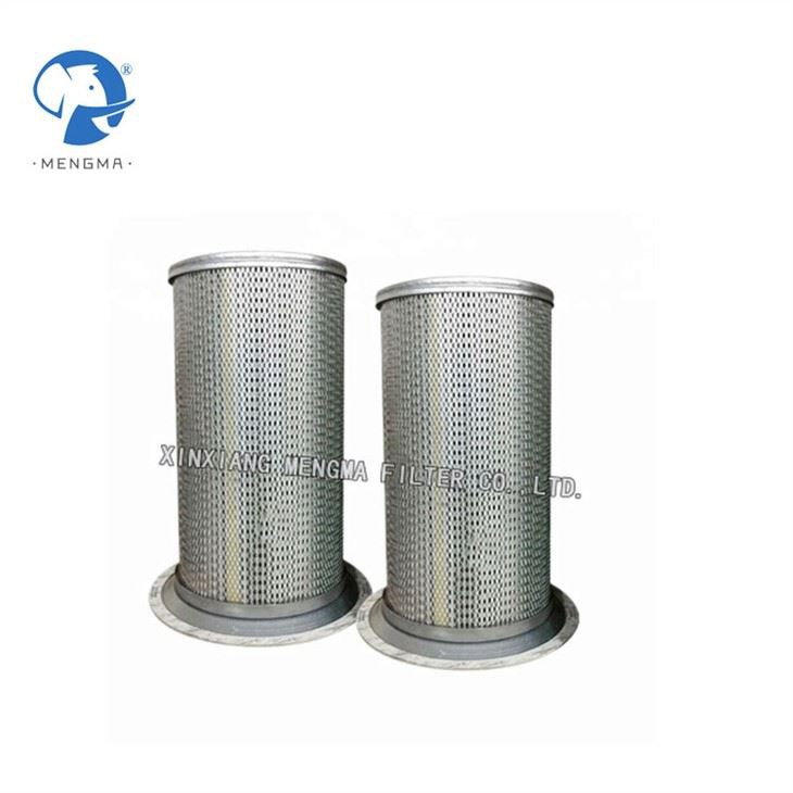 El separador original de gas-petróleo Sullair consta de cuerpo del tanque y elemento de filtro. La mezcla de gas-petróleo del motor principal golpea primero la pared del cilindro para reducir la velocidad de flujo y formar grandes gotas de aceite. Debido al peso de las gotas en sí, la mayoría de ellas se asientan en la parte inferior del separador. Por lo tanto, el separador de gas-petróleo desempeña el papel de separador primario y tanque de almacenamiento de petróleo. El cuerpo del tanque está equipado con dos elementos de filtro, elemento de filtro primario y elemento de filtro secundario. Después de la separación primaria, la mezcla de gas-aceite se separa finamente a través de dos elementos de filtro para separar una pequeña cantidad de aceite lubricante restante en el aire comprimido y acumularse en la parte inferior del elemento de filtro. A continuación, vuelve a la entrada de aire del motor principal a través de dos tubos de retorno y se succiona en la cámara de trabajo.